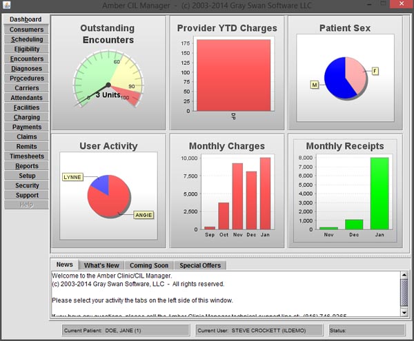 Amber CIL Manager™ is a full desktop application implemented in the latest Java technology connected via encrypted connection to the secure servers of Gray Swan Software. The result is an unprecedented feature set that presents your office's consumer and billing information to the properly authenticated attendants or office staff you designate, any time day or night, wherever they may be.